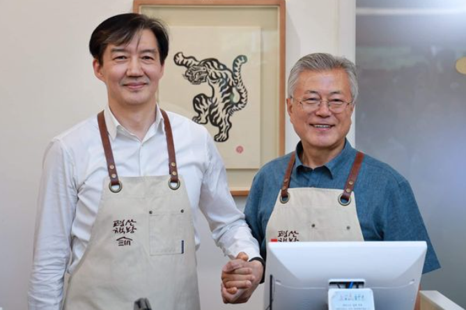 ▲ 문재인 전 대통령과 조국 전 법무부 장관이 지난 10일 경남 양산시 평산책방에서 손을 맞잡고 기념촬영을 하고 있다. [조국 전 법무부 장관 페이스북 캡처]