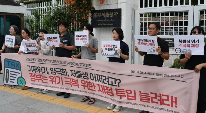 기자회견에 참석한 시민단체들은 저출생·고령화·기후위기 등 여러 사회적 위기가 도래하는 지금 이를 타개하기 위해서는 복지지출의 확대와 세원 마련 정책이 필요하지만 윤석열 정부는 복지정책에 경쟁·시장화·산업화를, 기후위기 대응에 원전을 내세우고, 말로는 건전 재정을 강조하면서 재벌부자감세를 추진하고 있다고 비판했다.
