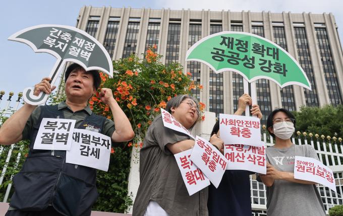 국가재정전략회의가 열리는 28일 오전 서울 종로 정부서울청사 앞에서 시민단체들이 기자회견을 열고 복합적 위기 대응을 위한 재정 확대 방안 마련을 촉구했다.
