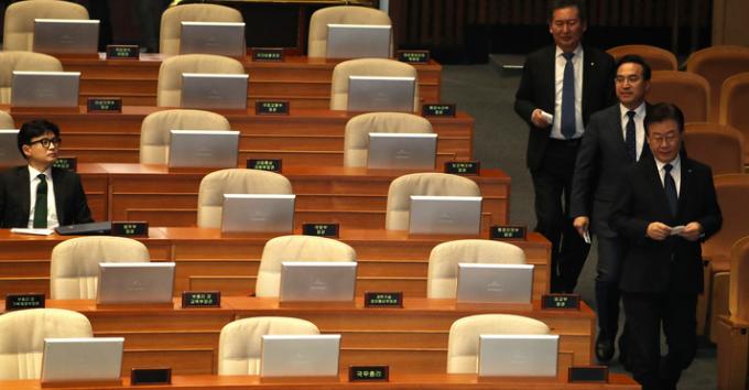 ▲ 더불어민주당 이재명 대표(오른쪽)가 지난 2월 27일 국회 본회의에서 진행된 자신에 대한 체포동의안 표결에서 기표함으로 걸어가는 모습을 한동훈 법무부 장관(왼쪽)이 국무위원 석에서 쳐다보고 있다. [뉴시스]