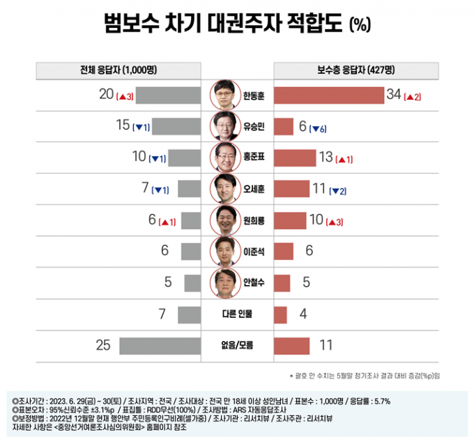 보수층 응답자에선 한 장관이 34%의 적합도를 얻어 경쟁자를 오차범위 밖으로 크게 따돌렸다. 이어 △홍 시장 13% △오 시장 11% △원 장관 10% △유 전 의원, 이 전 대표 6% △안 의원 5%로 집계됐다.