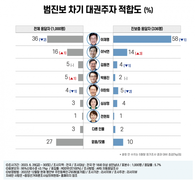 이재명 대표는 범진보 차기 대권주자 적합도에서 36%를 기록했다. 전달 대비 2%p 내렸다.