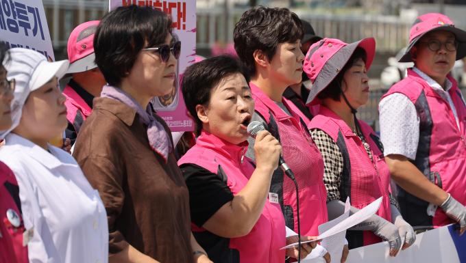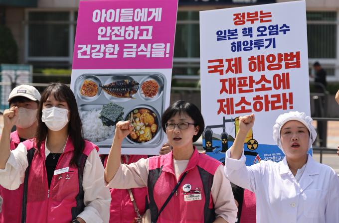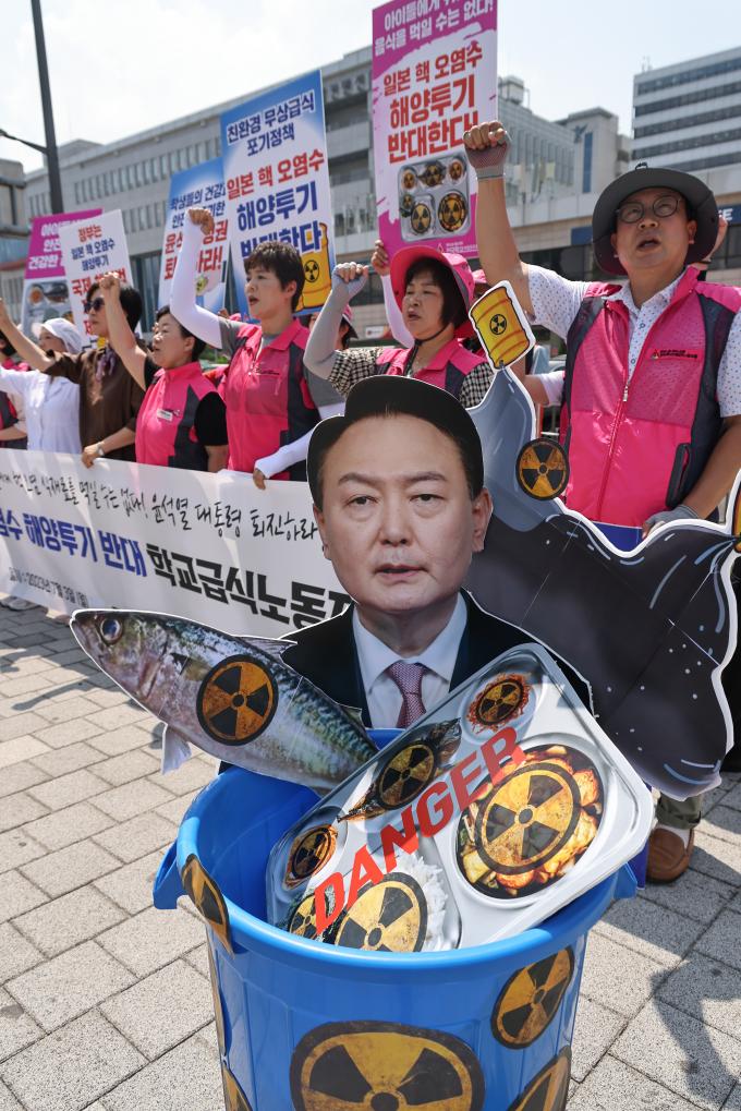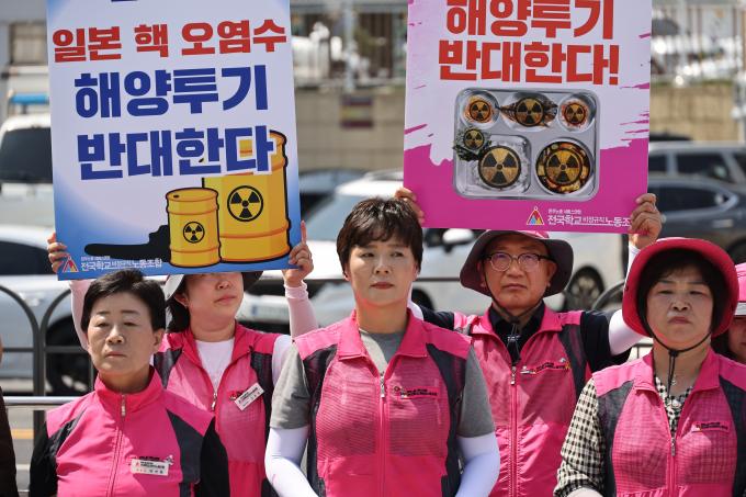 후쿠시마 핵 오염수 해양투기를 반대하는 학교급식노동자들의 기자회견이 3일 오전 서울 용산 대통령 집무실 앞에서 열렸다.