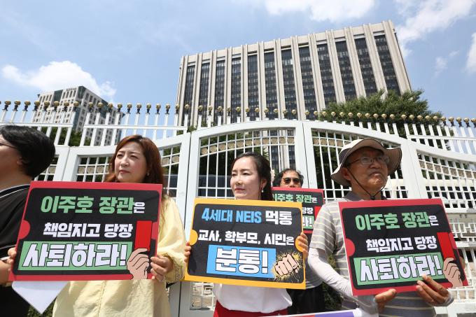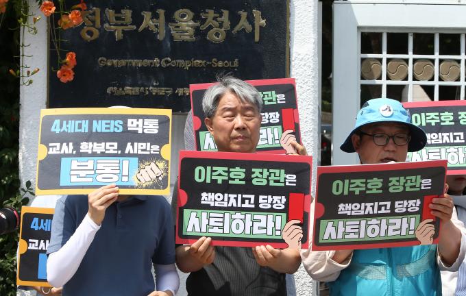 전국교직원노동조합(전교조), 참교육을위한전국학부모회 등 7개 교사·학부모·교육시민단체 들이 3일 오전 서울 종로구 정부서울청사 앞에서 4세대 나이스(NEIS) 먹통사태와 교육 퇴행 주범 이주호 장관 사퇴 촉구 기자회견을 열었다.