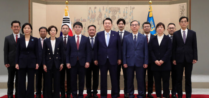 ▲ 윤석열 대통령이 3일 오전 서울 용산 대통령실 청사에서 신임 차관 임명장 수여식을 마친 뒤 기념촬영을 하고 있다. [뉴시스]