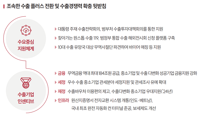 우선 신수출동력 분야(스마트팜·방산·에너지 등), 수출 인프라(무역금융)를 중심으로 대통령 주재 수출전략회의 및 범부처 수출투자대책 회의 등을 통해 지원 방안을 지속 마련할 방침이다.