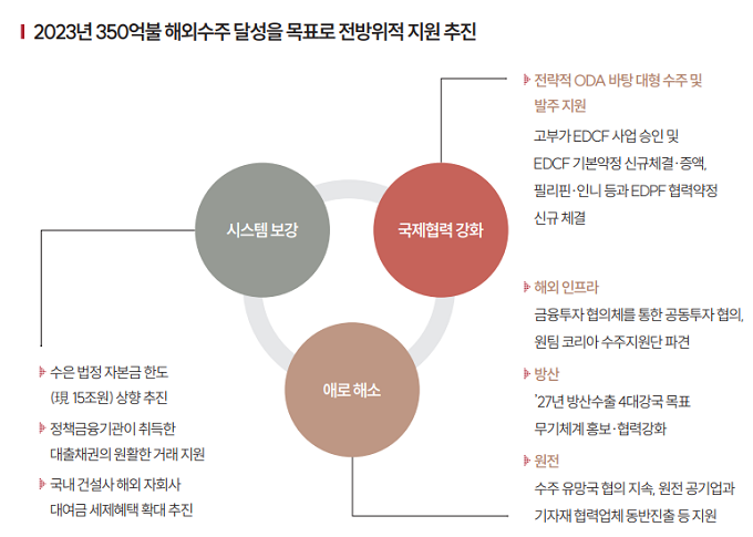 우선 대형 해외수주 등이 실제 수출로 원활하게 이어질 수 있도록 금융·세제 등 수주지원 시스템을 보완한다. 저신용국 리스크 분담 및 대규모 지원 필요성에 대비해 국가신용도 B+ 이하의 저신용국 인프라사업 수주 시 정책금융을 공급하는 수출입은행의 특별계정 출자를 지원하고, 현재 15조 원인 법정자본금 한도를 상향 추진한다.