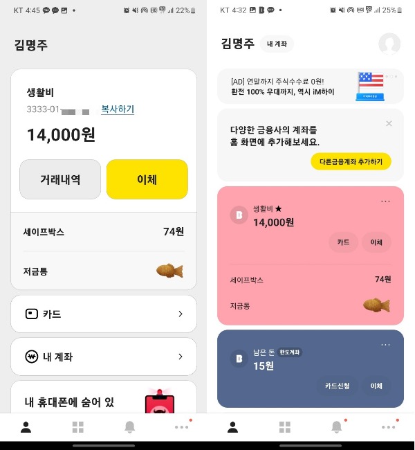 두 은행 앱에서 편의성은 차이가 났다. 카카오뱅크 앱에선 첫 화면 하단에 보이는 간편 홈 버튼을 1회만 누르면 해당 모드가 바로 적용됐다.