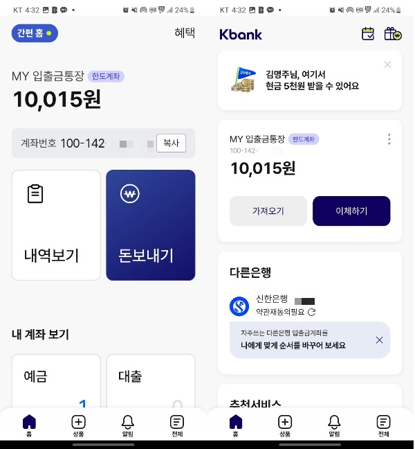 기자가 직접 카카오뱅크·케이뱅크 앱에서 간편 홈 모드를 적용해 본 결과, 대표 계좌 중심으로 화면이 구성됐다. 대표 계좌와 잔액 표시가 화면 상단에 배치됐다. 이어 사용자들이 가장 많이 사용하는 '조회(거래내역·내역보기)'와 '이체(돈보내기)'가 아래 나란히 배치됐다.