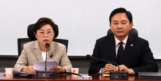 ▲ 국회 국토교통위 소속 국민의힘 간사인 김정재 의원(왼쪽)이 6일 국회 소통관에서 열린 서울-양평 고속도로 노선 변경 의혹 대응 당정간담회에서 발언하고 있다. 오른쪽은 원희룡 국토교통부장관. [뉴시스]