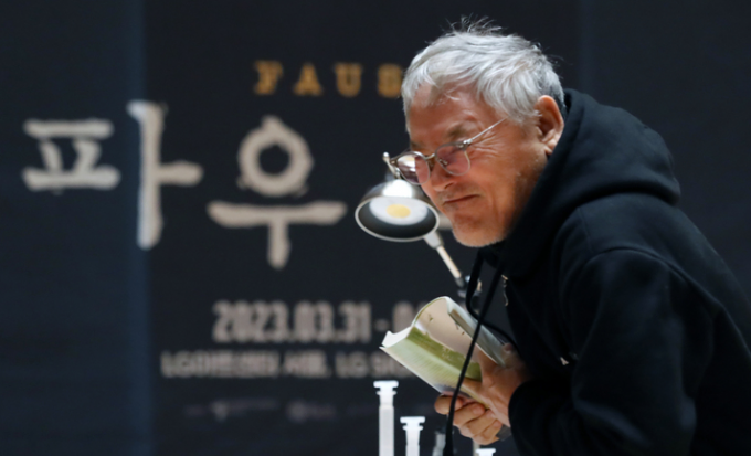 ▲ 연극 '파우스트'에서 파우스트 역을 맡은 배우 유인촌이 지난 3월 21일 서울 강서구 LG아트센터 서울 리허설룸에서 주요 장면 시연을 하고 있다. 유 씨는 6일 윤석열 대통령 문화특보로 임명됐다. [뉴시스]