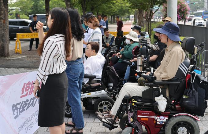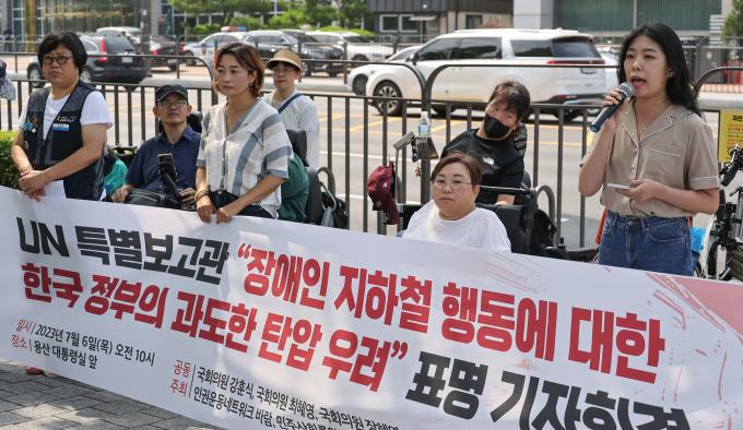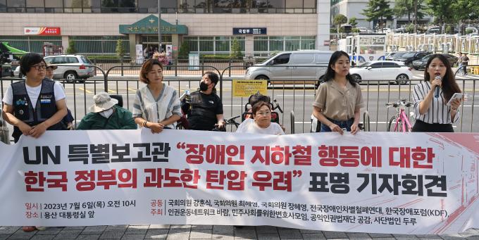 전국장애인차별철폐연대와 한국장애포럼 등 시민단체들이 6일 오전 서울 용산 대통령 집무실 앞에서 기자회견을 열고 UN특별보고관의 '장애인 지하철 행동에 대한 한국 정부의 과도한 탄압 우려' 표명에 대한 기자회견을 열었다.