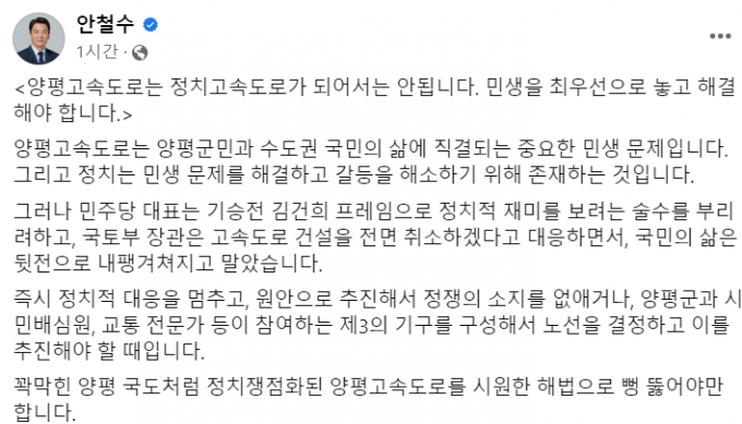 원안 추진 또는 제3기구 논의 제안 안철수 국민의힘 의원이 서울-양평 고속도로 종점 변경 건을 두고 갈등 중인 정치권을 비난하며 '민생 최우선' 원칙을 강조했다.