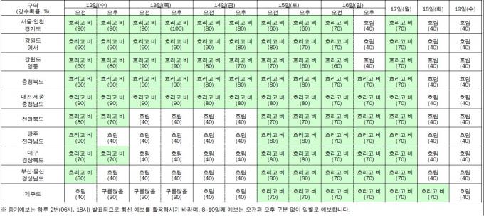 13일부터는 '길고 폭이 좁은' 장마전선이 남북으로 오르락내리락하면서 중부지방을 중심으로 전국에 강하고 많은 비를 뿌리겠다. 중부지방에는 17일까지 매일 비가 예보됐다. 남부지방과 제주에도 비가 내릴 전망이다.