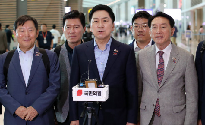 김기현 대표는 미국 방문을 위해 출국하기 직전 인천공항에서 기자들과 만나 "민주당이 '똥볼'을 찬 것"이라며 "지금 탈출구가 필요한 쪽은 민주당 쪽"이라고 말했다.