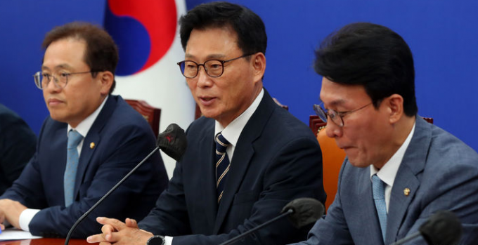 ▲ 더불어민주당 박광온 원내대표가 11일 국회에서 열린 원내대책회의에서 발언하고 있다. 오른 쪽은 김민석 정책위의장. [뉴시스]