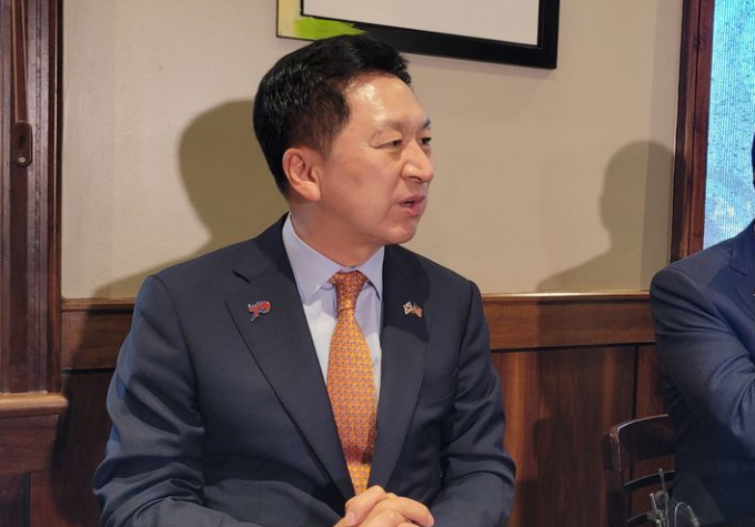 ▲ 국민의힘 김기현 대표가 11일(현지시간) 미국 워싱턴DC 인근에서 특파원들과 간담회하고 있다.