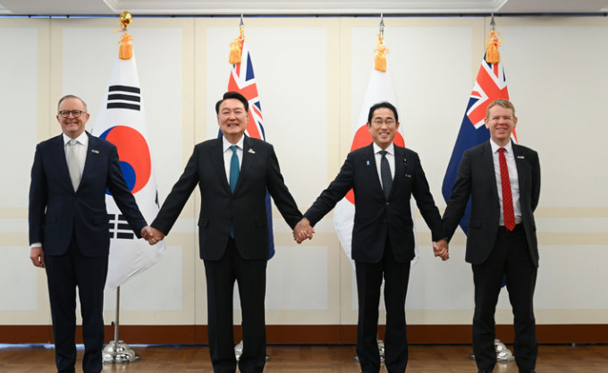 ▲ 윤석열 대통령이 12일(현지시간) 리투아니아 수도 빌뉴스의 한 호텔에서 열린 AP4(한국·일본·호주·뉴질랜드) 정상회의에서 참석자들과 기념촬영을 하고 있다. 왼쪽부터 앤서니 앨버니지 호주 총리, 윤 대통령, 기시다 후미오 일본 총리, 크리스 힙킨스 뉴질랜드 총리. [뉴시스]
