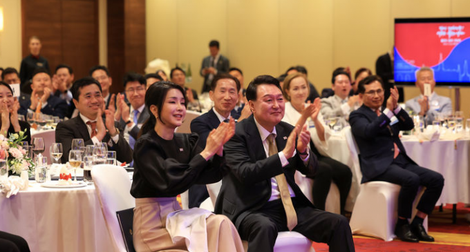▲ 폴란드를 공식 방문한 윤석열 대통령과 부인 김건희 여사가 12일(현지시간) 바르샤바의 한 호텔에서 열린 동포간담회에 참석해 손뼉을 치고 있다. [뉴시스]