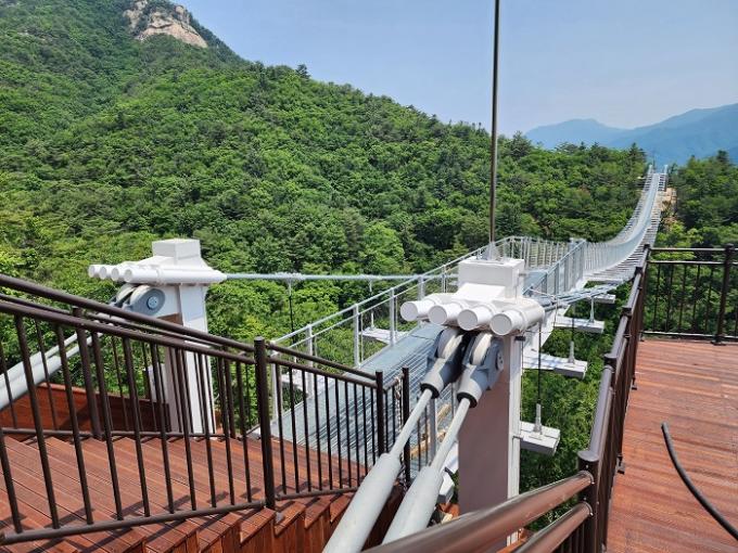 출렁다리는 등산로 입구에서 1.5㎞ 올라간 지점에 계곡을 가로질러 길이 210m, 폭 1.5m 규모로 설치됐다. 다리 양쪽에는 50m 높이의 전망대가 있어 주변 경관을 한눈에 볼 수 있다.