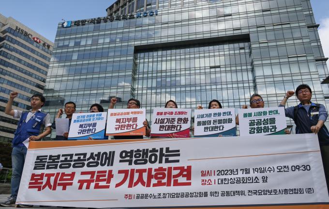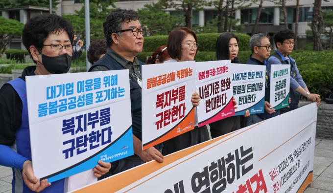 19일 오전 보건복지부가 주최한 '신노년층을 위한 요양시설 서비스 활성화 방안 연구 관련 공청회'가 열리고 있는 서울 상공회의소 앞에서 장기요양공공성강화를위한공동대책위원회와 전국공공운수사회서비스노조가 '대기업 이윤을 위해 돌봄공공성 포기하는 복지부 규탄 기자회견'을 열었다.