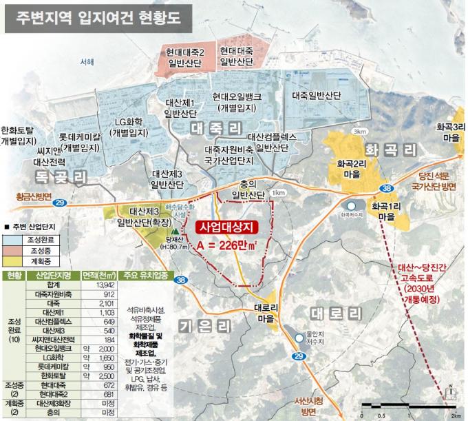 대산 그린컴플렉스는 2027년까지 7120억원을 투입해 총 226만㎡(약 68만평) 부지에 산업시설용지만 142만㎡(43만평)에 달하는 대규모 산업단지로 조성된다.