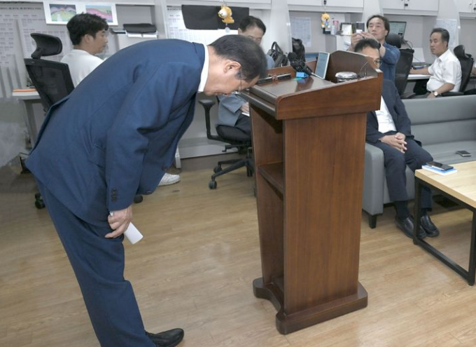 홍 시장은 윤리위 회의를 하루 앞둔 전날 대구 동인청사에서 기자회견을 갖고 "수해로 상처 입은 국민과 당원 동지 여러분께 심려를 끼쳐드린 점 진심으로 사과드린다"고 고개를 숙였다.