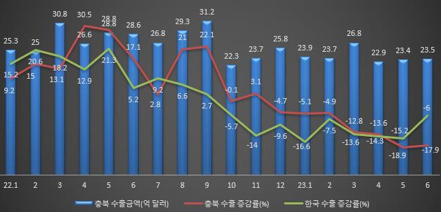 전기차 시장의 성장으로 이차전지와 양극재 수출이 전년 대비 각각 36%, 82% 늘고 미국으로의 태양광 모듈 수출이 68% 증가하면서 충북 수출을 이끌었으나 반도체 등 수출 감소분을 상쇄시키지는 못했다.