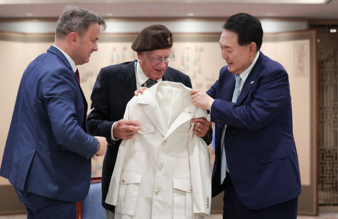 ▲ 윤석열 대통령이 25일 서울 용산 대통령실 청사에서 6·25 정전협정 체결 70주년 기념일 및 유엔군 참전의 날을 맞아 방한한 룩셈부르크 참전 용사 레옹 모아옝 씨에게 '영웅의 제복' 재킷을 선물하고 있다. 왼쪽은 자비에 베텔 룩셈부르크 총리. [대통령실 제공]