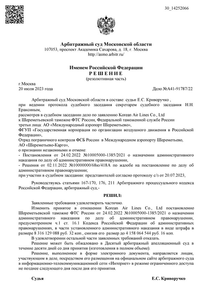 ▲ 대한항공에 590억 원 과징금을 선고한 7월20일자 러시아 법원 판결문. [모스크바 중재법원]