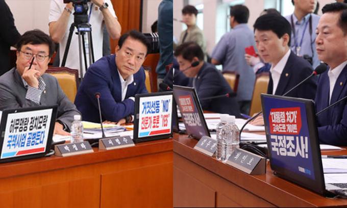 이날 현안 질의는 전체회의 개의 때부터 험로를 예고했다. 국민의힘은 '허무맹랑 정치모략 국책사업 골병든다'는 문구가 적힌 스티커를 노트북에 붙였고 야당을 향해 "정치공세" "거짓 선동"이라고 공격했다.