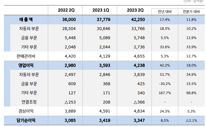 매출은 자동차에서 33조7663억원, 금융 및 기타로 8조4834억원을 일으키며 총 42조2497억원을 기록했다. 작년 동기 대비 17.4% 증가한 수치다. 순이익은 3조3468억원으로 8.5% 늘었다.