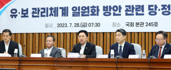 국민의힘 박대출 정책위의장은 브리핑에서 "지난 30년간 논의를 매듭짓기 위해 유보통합 쟁점을 먼저 논의했던 과거의 추진 방식에서 벗어나 복지부와 시도의 영유아 보육업무를 교육부와 시도 교육청으로 이관하는 관리체계 일원화를 우선 추진키로 했다"고 밝혔다.
