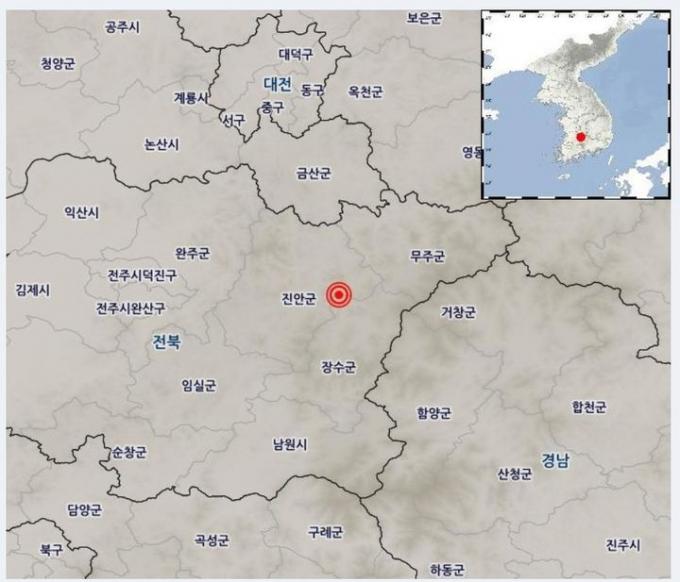 기상청 "금일 지진 올 들어 발생한 남한 지진 중 3위" 29일 오후 7시7분 경 전북 장수군 북쪽 17㎞ 지역(천천면)에서 진도 규모 3.5 지진이 발생했다고 기상청이 밝혔다. 기상청은 지진 발생 위치를 북위 35.80, 동경 127.53도, 진원의 깊이는 6㎞로 추정했다. 최초 규모는 4.1이었지만 수동으로 3.5로 수정됐다.
