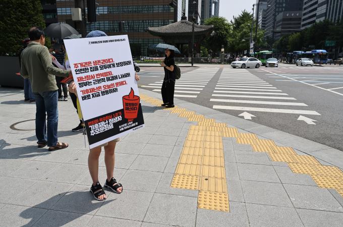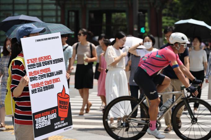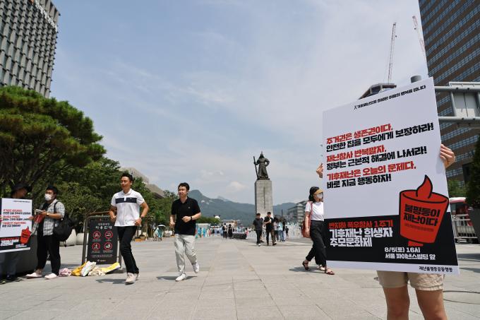 반지하 폭우 참사 1주기를 맞아 1일 오전 재난불평등공동행동 활동가들이 서울 광화문광장에서 지난해 폭우로 희생된 반지하 거주자들을 추모하고 정부에 재난참사 반복 발생을 해결하기 위한 근본적인 문제해결을 촉구하는 1인시위를 하고 있다.