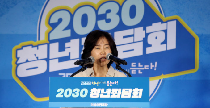 ▲ 더불어민주당 김은경 혁신위원장이 지난달 30일 서울 성동구 성수동의 한 카페에서 열린 2030 청년좌담회에 참석해 인사말을 하고 있다. [뉴시스]