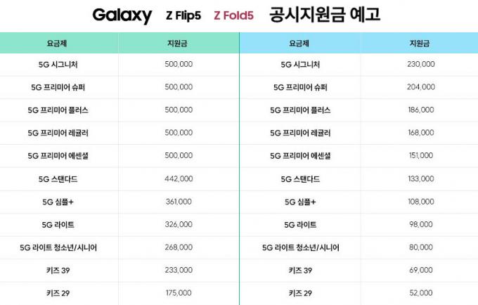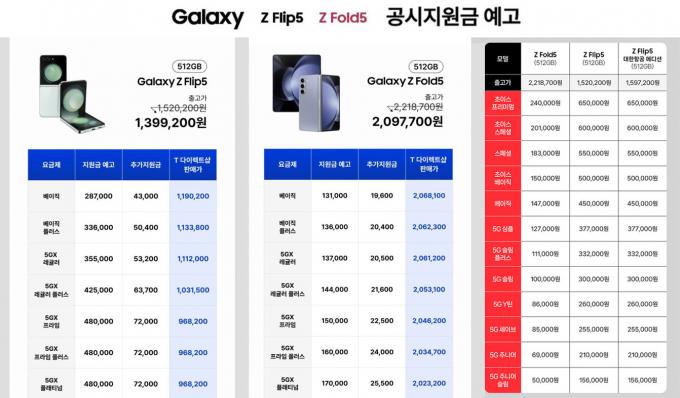 SK텔레콤의 경우 플립5 구매자 대상 베이직 요금제 28만7000원을 시작으로 5GX 프라임과 프라임플러스, 플래티넘 요금제에 48만 원의 공시지원금을 매겼다.