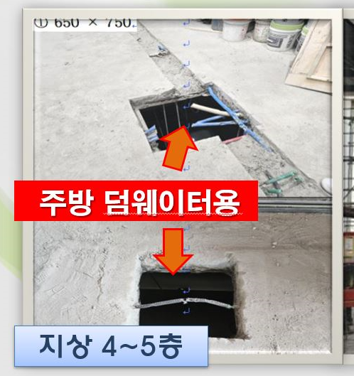 한 입주민은 "지상 4층부터 6층을 예식장으로 쓸 사용주가 예식장 피로연장으로 실어 나를 덤웨이터(소형 승강기)를 설치하기 위해 마음대로 바닥에 구멍을 뚫었다"고 설명했다.