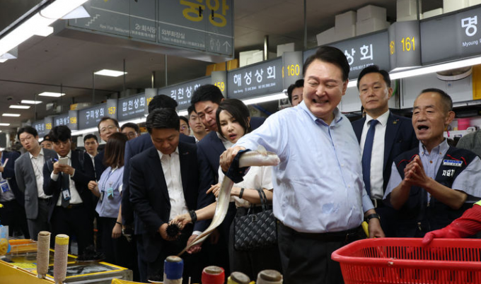 ▲ 윤석열 대통령이 지난달 27일 부산 중구 자갈치시장을 방문해 붕장어를 잡아보고 있다. [뉴시스]