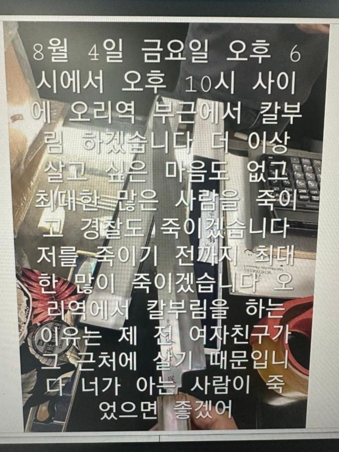 4일 분당지역 한 맘 카페와 경찰에 따르면 "8월 4일 금요일 오후 6시에서 오후 10시 사이에 오리역 부근에서 칼부림하겠다. 더 이상 살고 싶은 마음도 없고 최대한 많은 사람을 죽이고 경찰도 죽이겠다. 나를 죽이기 전까지 최대한 많이 죽이겠다"는 내용의 예고글이 맘 카페에 올라 왔다.