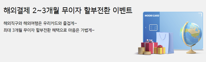 국민카드는 8월 한 달 동안 국제브랜드 신용카드 회원 대상으로 해외 가맹점에서 건당 10만 원 이상 이용 후 2~5개월 할부전환 신청 시 무이자할부 혜택을 제공한다. 우리카드도 9월 30일까지 1000원 이상 해외결제 건 할부 전환시 2~3개월 무이자 혜택을 제공한다.