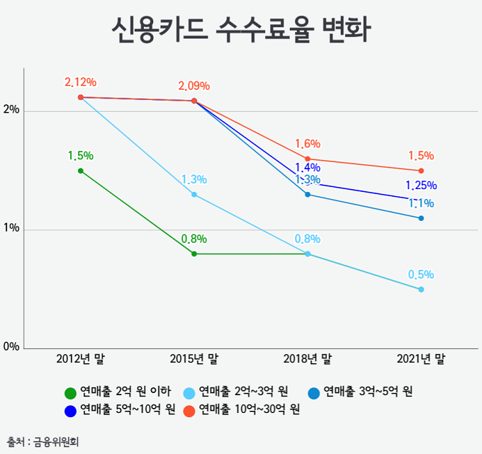 카드업계 관계자는 "적격비용 취지에 맞지 않게 수수료율은 지속해서 인하해온 만큼 총선을 앞둔 내년에도 인하될 것으로 예측한다"라고 말했다.