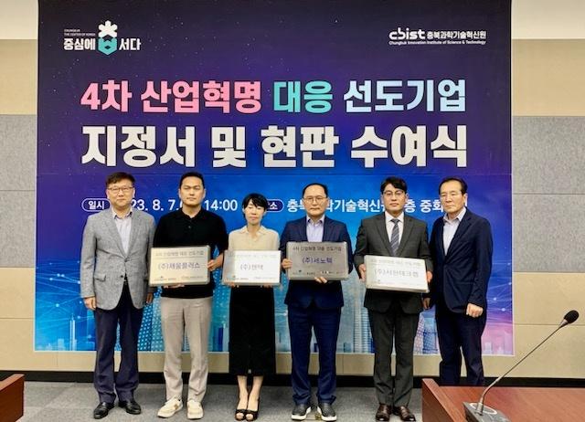 고용, 수출실적, 성장잠재력과 디지털전환 기술역량 높은 평가 충북도와 충북과학기술혁신원은 7일 '2023년 4차 산업혁명 대응 선도기업'으로 선정된 젠텍, 서현테크켐, 세노텍, 채움플러스 등 4개사에 대해 선도기업 지정서와 현판을 수여했다.