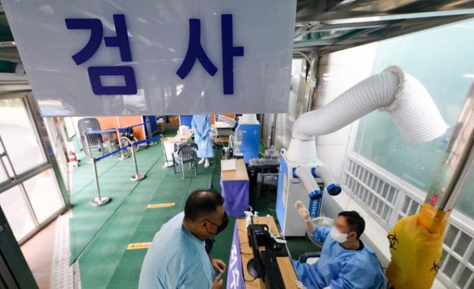 ▲8월 1일 오후 서울 동대문보건소 선별진료소에서 한 시민이 코로나19 검사 접수를 하고 있다. [뉴시스]