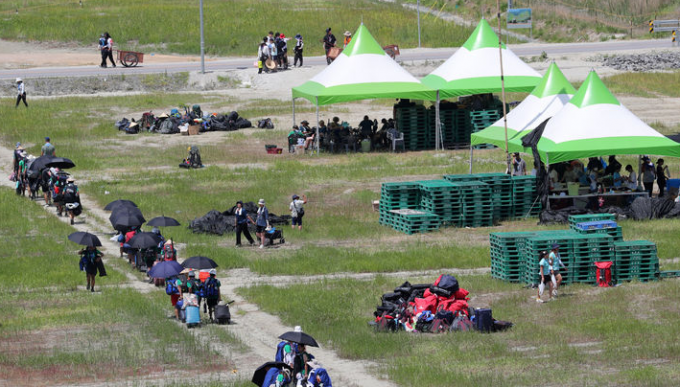 ▲ '2023 세계스카우트잼버리' 참가자들이 8일 오후 전북 부안군 새만금 야영지에서 철수하기 위해 버스 탑승 장소로 이동하고 있다. [뉴시스]