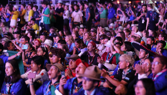 ▲ '2023 세계스카우트잼버리대회' 참가자들이 지난 7일 전북 부안군 새만금 야영지에서 열린 새만금 갓 탤런트 공연을 관람하며 즐기고 있다. [뉴시스]