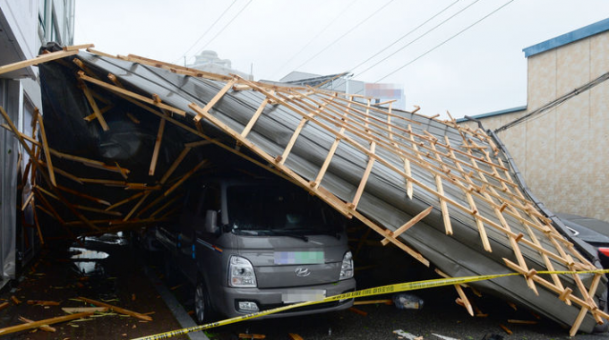 ▲ 태풍 '카눈'이 한반도를 강타한 10일 울산 남구의 한 가구점 지붕이 강풍으로 떨어져 있다. [뉴시스]