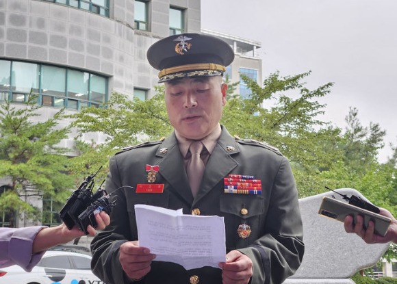 ▲ 채수근 상병 사망사건을 놓고 사건 이첩에 대한 항명 혐의로 보직해임된 전 해병대 수사단장 박정훈 대령. 사진은 지난 11일 박 대령이 서울 용산구 국방부 군검찰단 앞에서 입장문을 발표하는 모습. [뉴시스]
