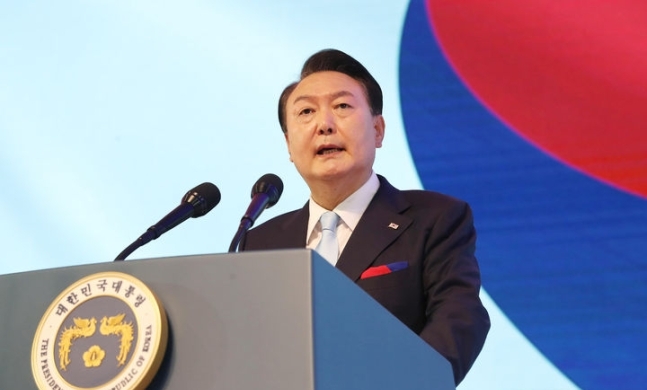 ▲ 윤석열 대통령이 15일 오전 서울 서대문구 이화여대 대강당에서 열린 제78주년 광복절 경축식에서 경축사를 하고 있다. [뉴시스]