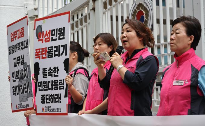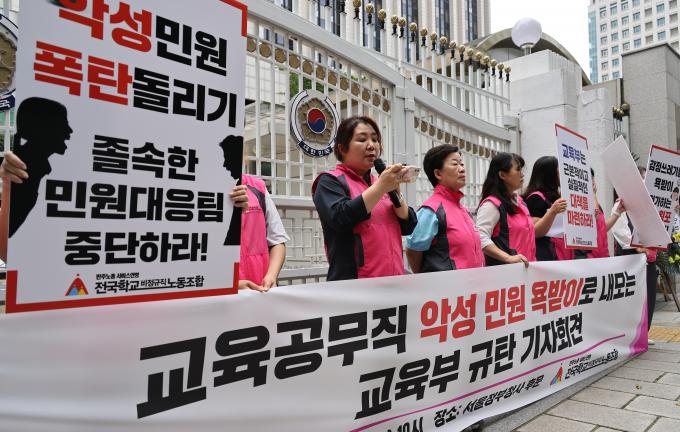 학비노조는 "악성민원이 교무실, 행정실을 비롯해 유치원, 돌봄교실, 급식실, 도서관 등 학교 곳곳에서 끊이지 않고 있고, 이미 많은 교육공무직 노동자들이 악성 민원으로 고통과 괴로움을 호소하고 있으며 심지어 악성민원으로 인한 갑질로 극단적인 선택을 한 사례도 있다"고 밝혔다.